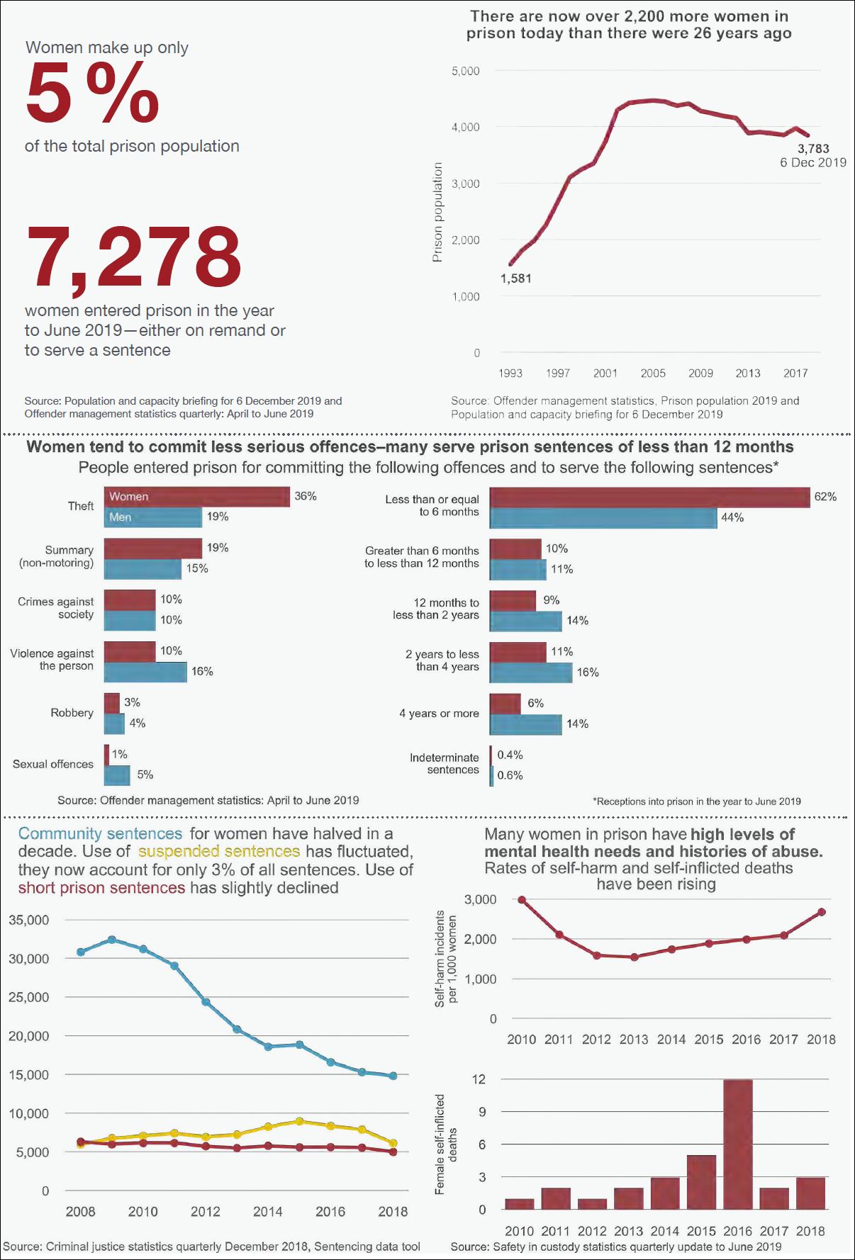 robbery, sexual offences, fraud, drugs, and motoring offences combined. The proportion of women serving very short prison sentences has risen sharply. In 1993 only a third of custodial sentences given to women were for less than six months—in 2018 it was nearly double this (62%).
