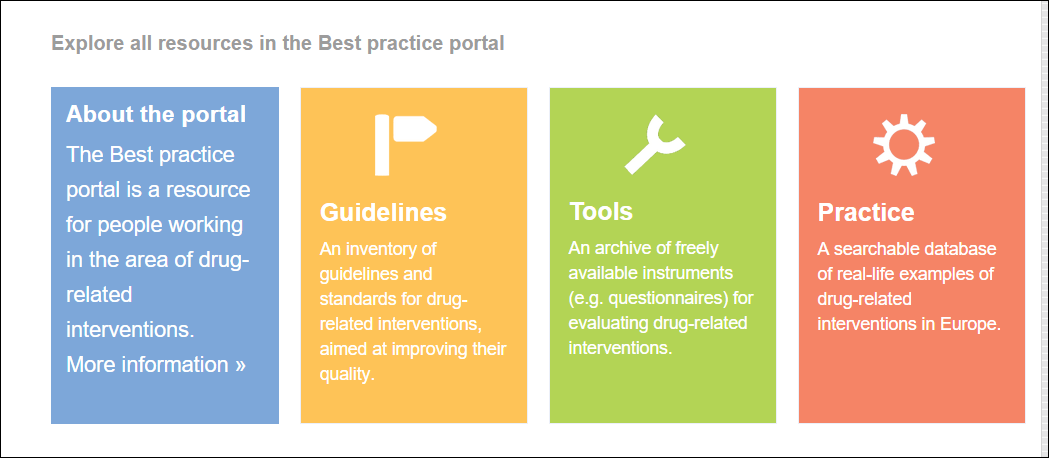 The European Monitoring Centre for Drugs and Drug Addiction has a very helpful best practice portal which collates key research, real world examples of best practice, tools, resources and guidelines in the same online space.