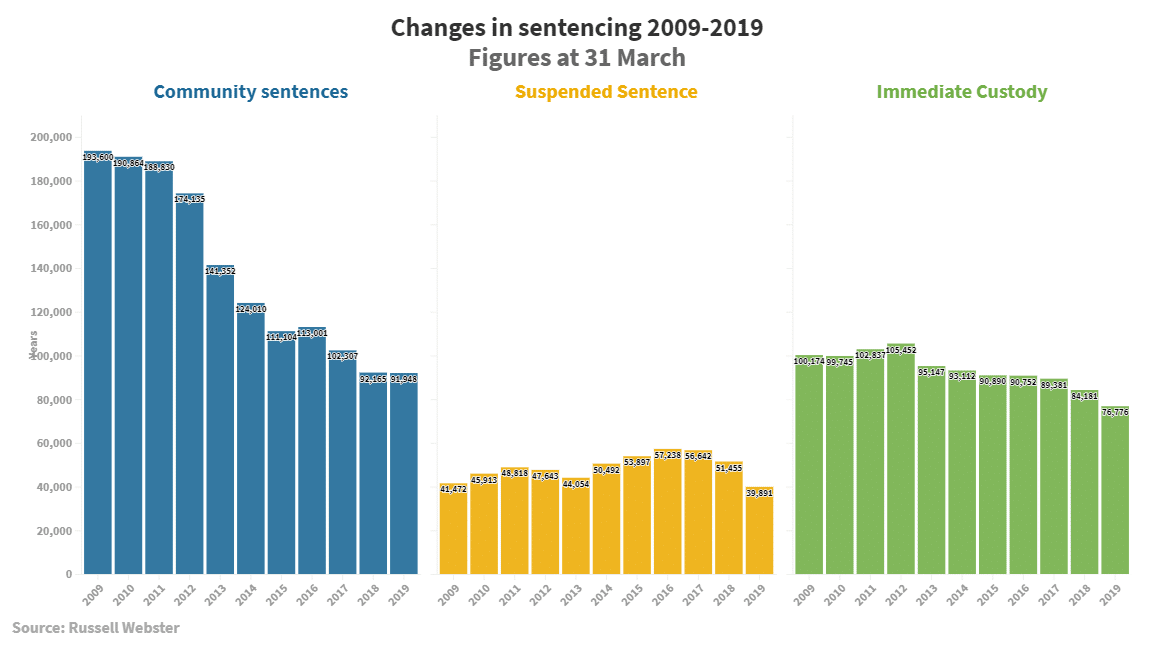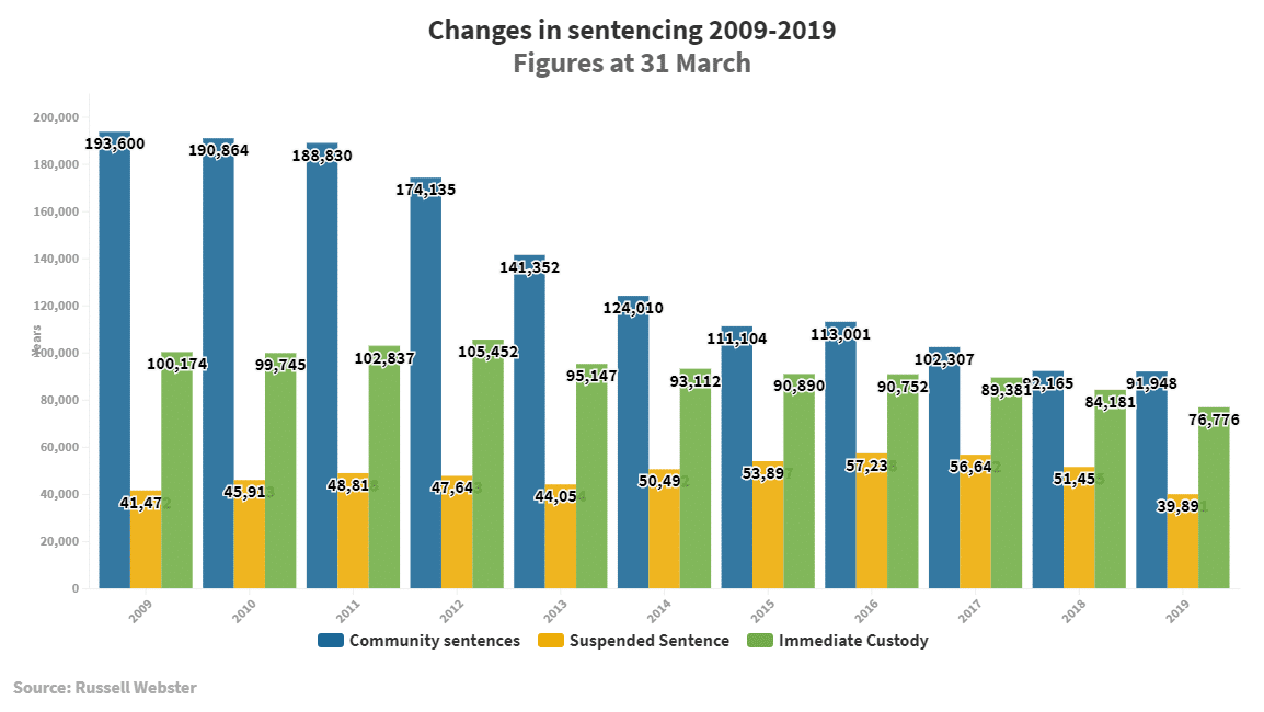 The total number of people sentenced in our courts has fallen consistently from 1,365,078 individuals in the year ending March 2009 to 1,191,782 people this March – a fall of 12.7%. Of course, most people are dealt with by a financial penalty (77.4% in the last year). However, the proportion dealt with by community sentence has almost halved from 14.2% in 2009 to just 7.8% this year.