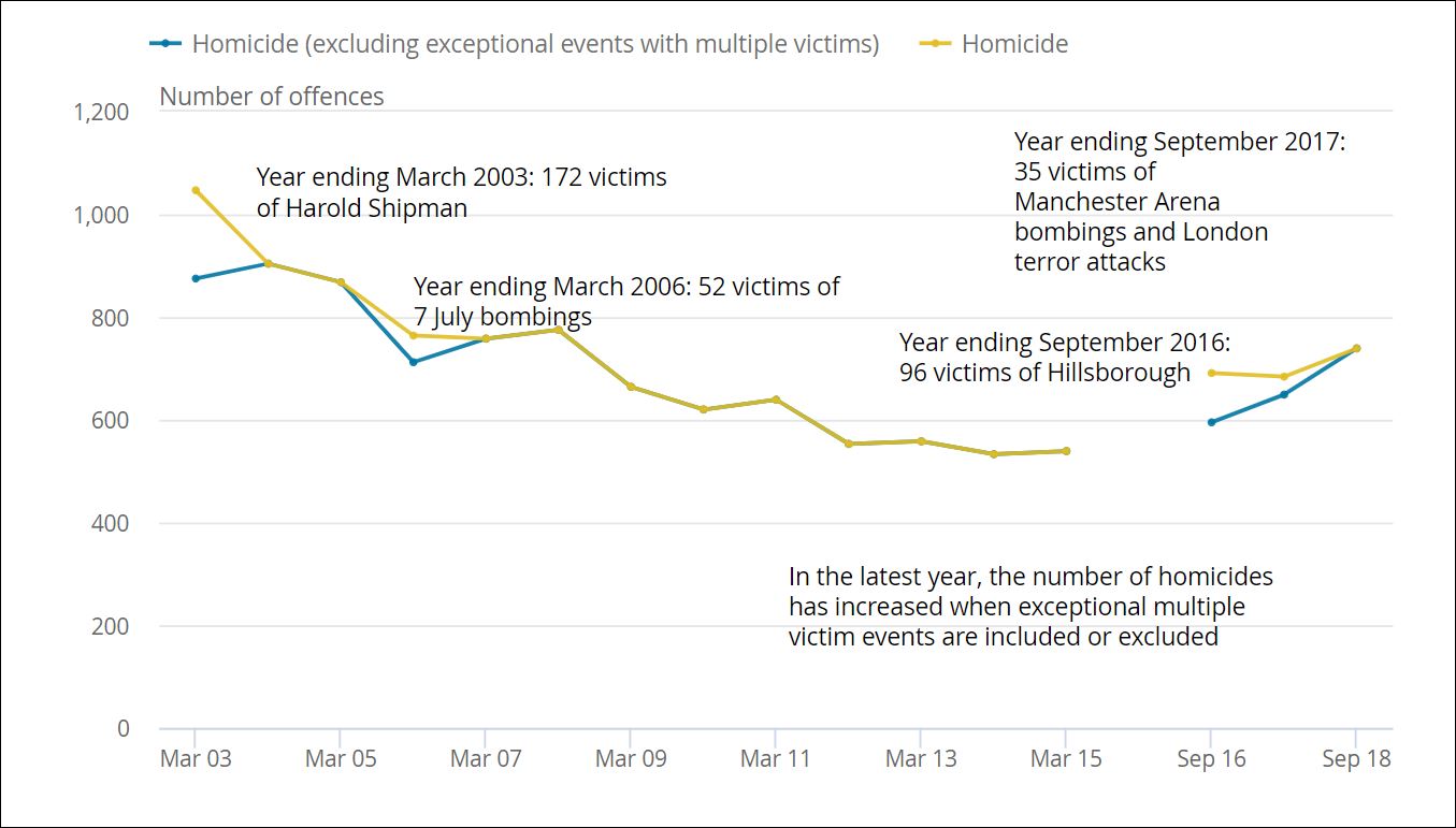 The total number of homicides recorded by the police rose by 8% (to 739 offences). When the victims of terrorist attacks such as those in Manchester and London in recent years are excluded, a worrying upward trend can be seen. The latest figures show 90 more homicides than the previous year, a 14% rise from 649 to 739 offences. This continues an upward trend in homicides since March 2014, indicating a change to the long-term decrease over the previous decade.