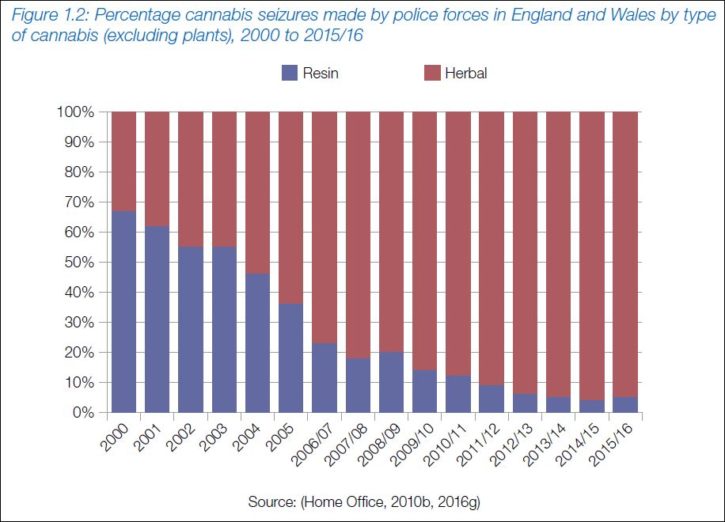 3: Herbal cannabis has come to dominate the market. While resin was involved in around two-thirds of cannabis seizures in 2000, it was involved in only five per cent in 2015/16.