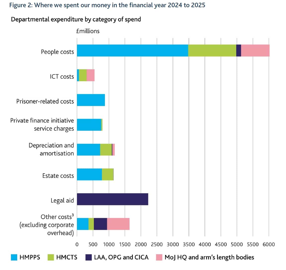 The MoJ has just (30 October 2025, updated on 11 November) published its annual report and accounts for the last (24/25) financial year. It’s a blog tradition that I trawl through its (rarely thrilling) contents – all 314 pages – in an effort to unearth some noteworthy nuggets of information. I hope you find them interesting . The MoJ is responsible for no fewer that 31 executive agencies and other arm’s length bodies. The big five, which deliver the bulk of the department’s services, are almost certainly well known to readers: