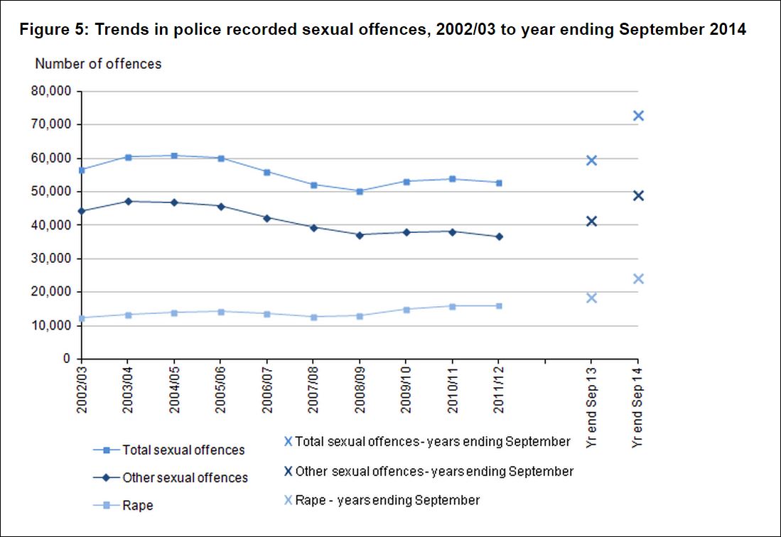 The number of police recorded sexual offences in the year to March 2014 showed a 20% increase compared with the previous year, rising to a total of 64,205 incidents across England and Wales. This is the highest ever figure recorded on a financial year basis.