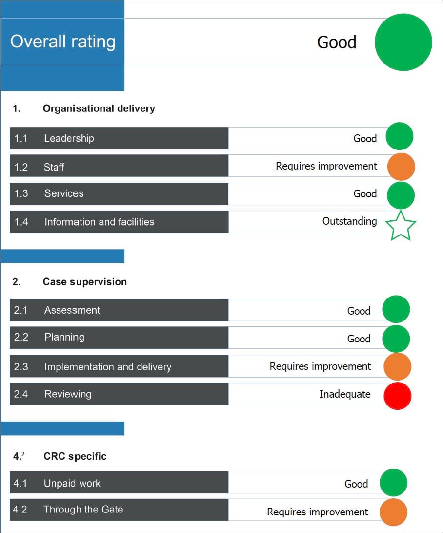 This is the fourteenth inspection of a CRC under the Probation Inspectorate’s new four-band rating system. Although, it is a relief and pleasure to finally find a CRC rated as “good”; it is disappointing that we must dilute that assessment in two ways.