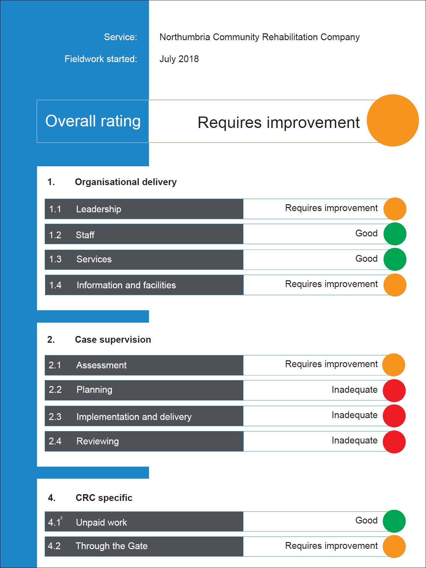 The Probation Inspectorate works on a four-band rating system: excellent, good, requires improvement and poor. This is the fourth inspection of a CRC under the new rating system and all four areas (Northumbria, West Yorkshire, Merseyside and Essex) have been rated in the third band: “requiring improvement”.