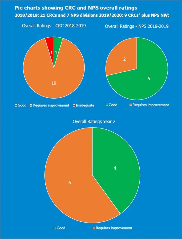“While it has been encouraging to see some signs of improvement this year, with three probation services improving their overall rating to ‘good’, others remain a concern. In some areas we continued to find budgets being squeezed, staff under pressure and unacceptably high caseloads. This has inevitably resulted in poorer-quality supervision, with five CRC services rated as ‘Inadequate’ against all our offender supervision standards”.