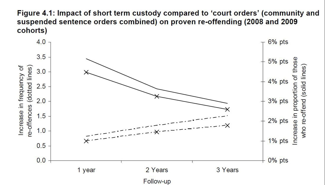 The re-offending rate for those getting short prison sentences was three percentage points higher than similar offenders given a community sentence and seven percentage points higher than those given a suspended sentence order. In addition, short term custody was associated with up to 1 more re-offence per person on average than both community and suspended sentence orders.
