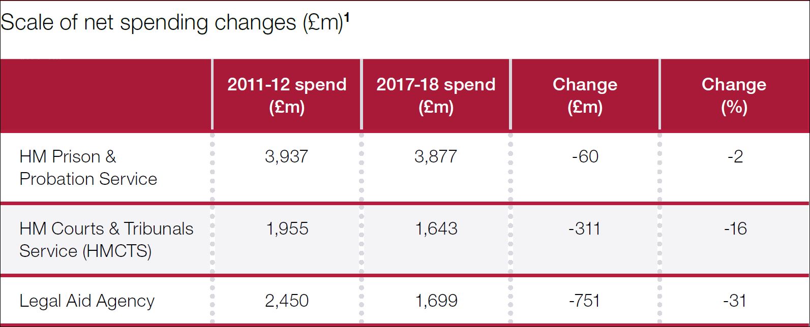 The table below shows spending between 2011/12 and 2017/18 (the 2011/12 figures are adjusted to 2017/18 figures so the spending changes are presented in real terms). As you can see, most of the pain has been felt by Legal Aid and the courts.