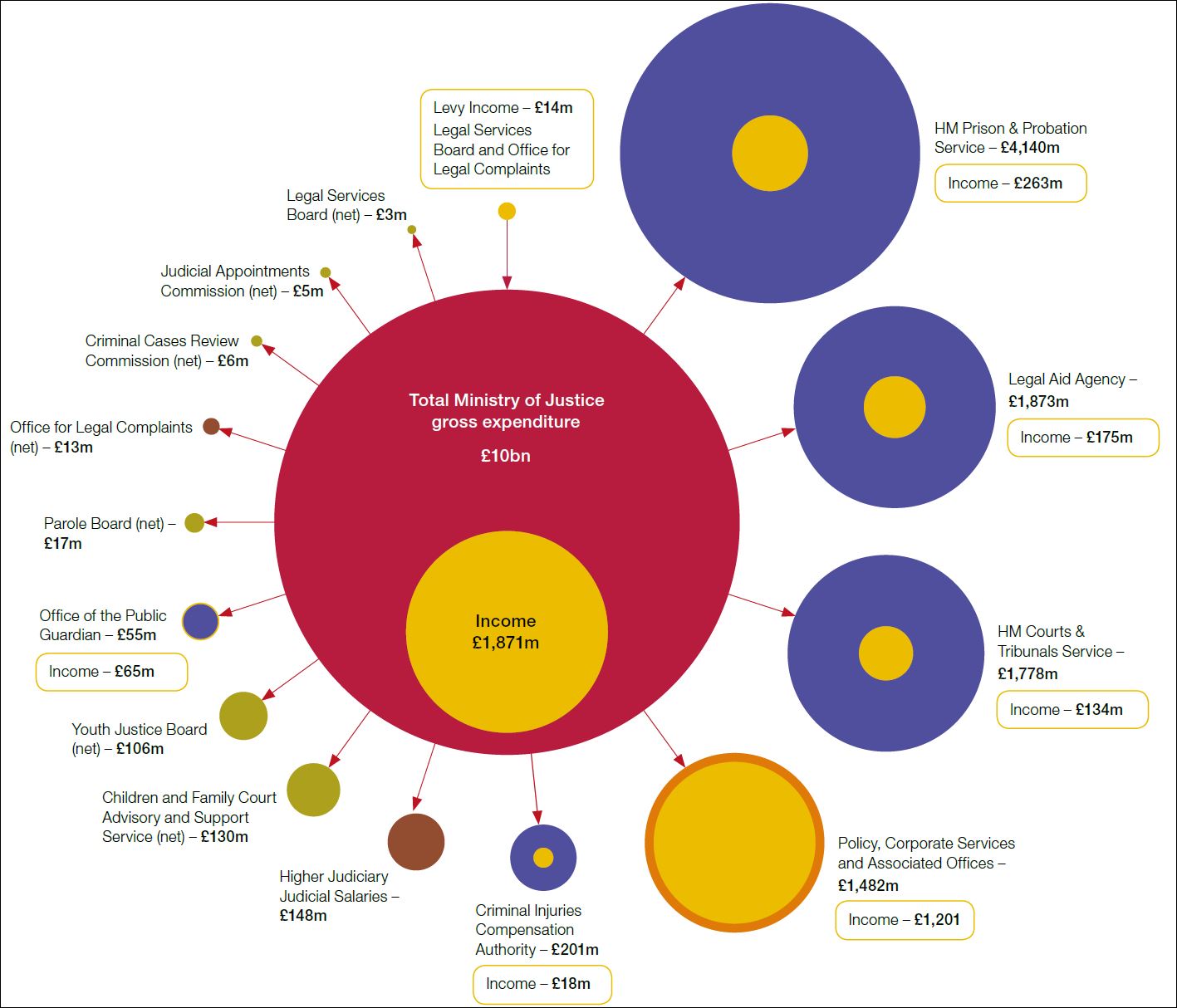 The Ministry’s total operating expenditure in 2017-18 was £10 billion, with income of £1.9 billion reducing