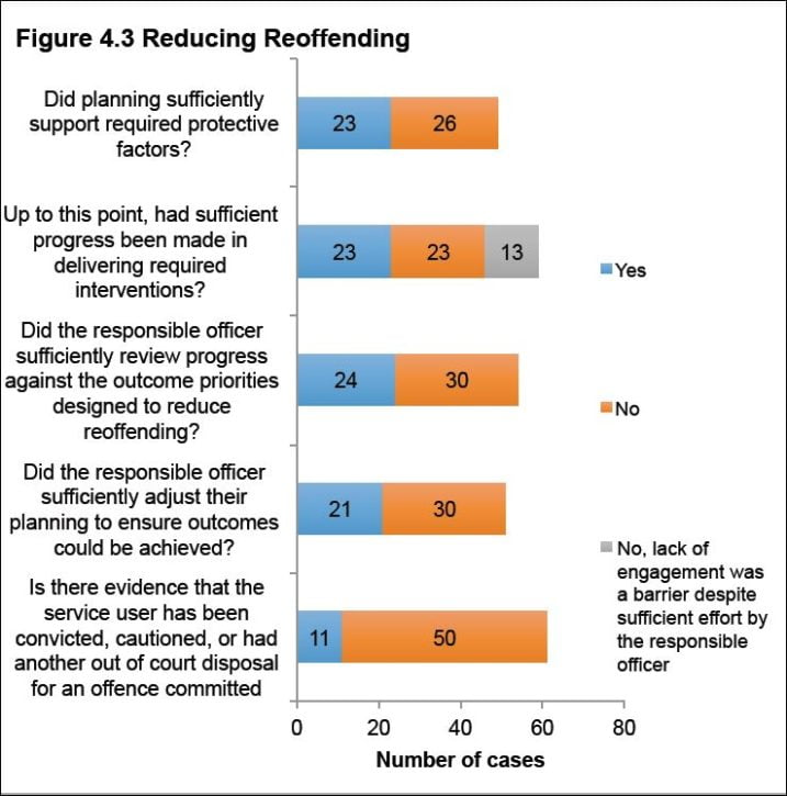 - Responsible officers did too little to understand the key factors linked to service users’ offending behaviour. This led to limited sentence planning. There was greater focus on meeting sentence planning targets than meaningfully engaging with service users to get the plan right. Progress was slow and in many cases there were delays in delivering the interventions service users needed to support their desistance from offending.
