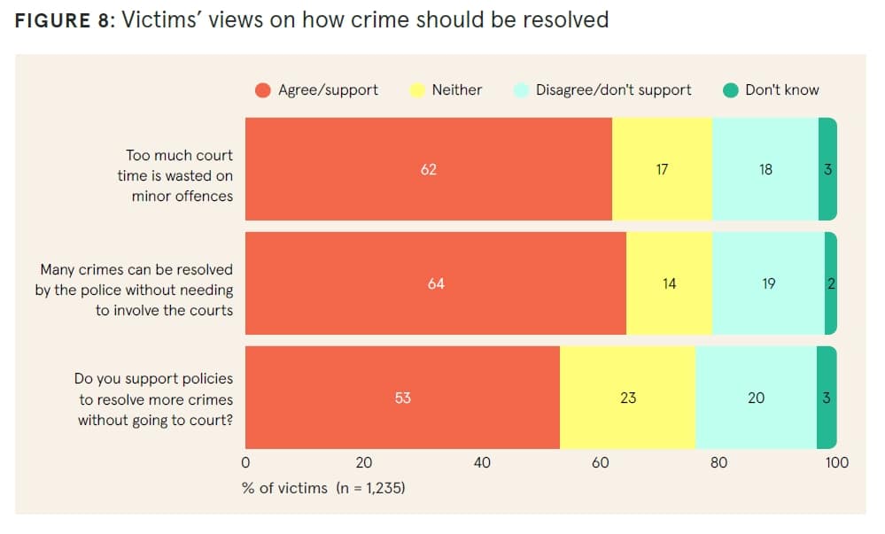Overall victims in the survey were supportive of resolving more crimes without going to court (53% were supportive versus 20% not). They felt that too much court time is wasted on minor offences, for which court should be the last resort (62% agree vs 18% disagree), and that many crimes can in fact be resolved by the police instead (64% agree vs 19% disagree).