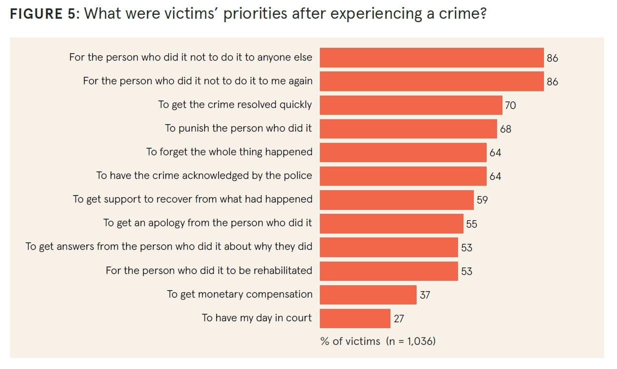 They found that victims’ biggest priority after a crime occurs is for the person who harmed them not to do it again. They also want the crime to be resolved quickly, for the police to acknowledge what happened, take it seriously and take action to address it.