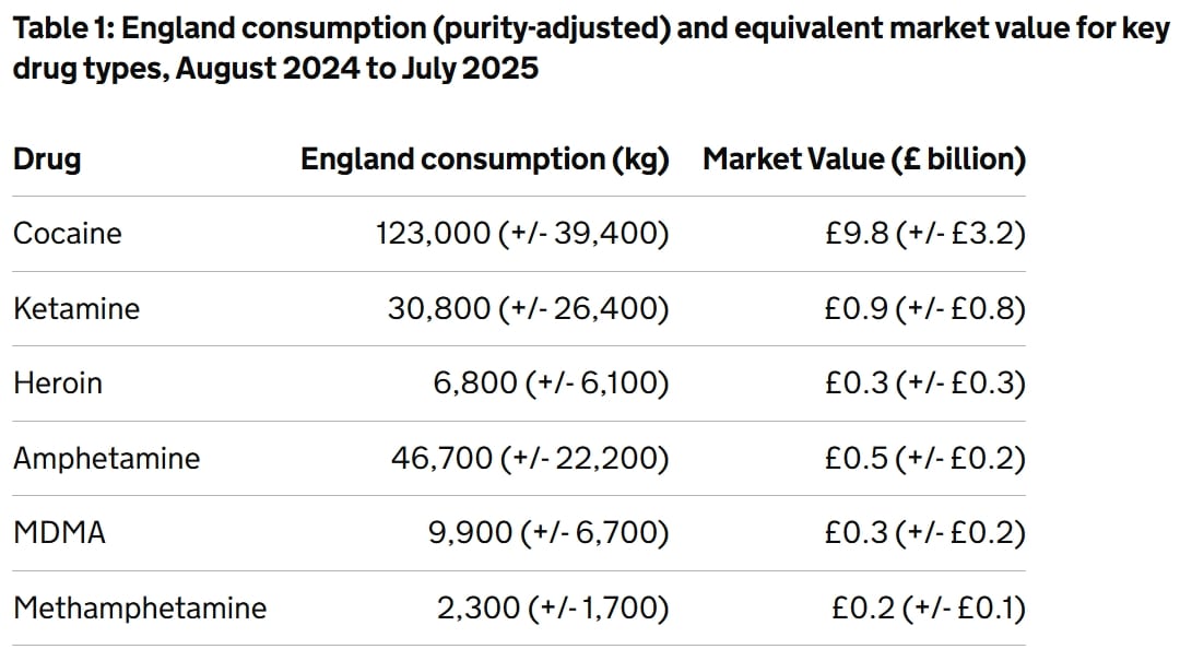 - amphetamine consumption was estimated to be 46,700kg, equating to a £0.5 billion market value