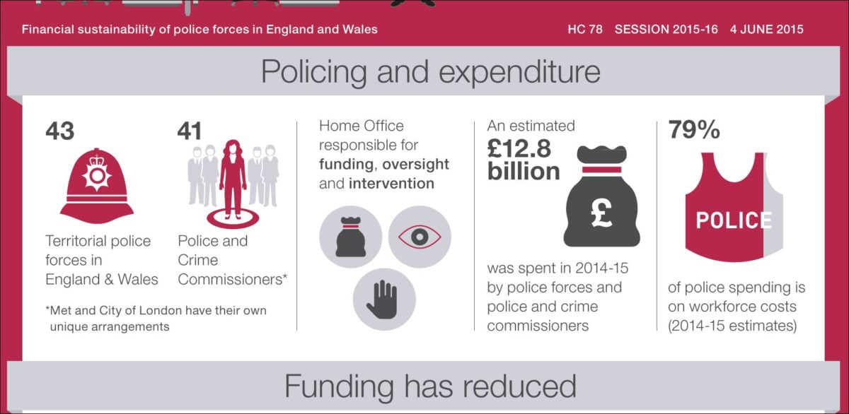 These figures are from the recent (4 June 2015) National Audit Office report: “Financial sustainability of police forces in England and Wales”. NAO reports are invaluable, in my opinion, because the organisation has no political axe to grind and merely examines costs and performance as fairly as possible.