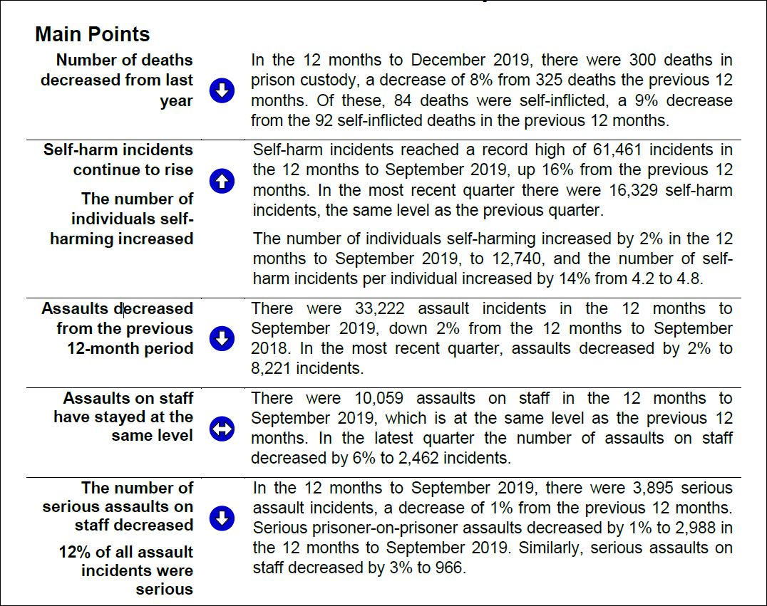 The latest quarterly safety in Custody statistics bulletin, published today make for predictably grim reading. Despite the fact that figures have been worsening every quarter for the last five years, the new bulletin, which covers deaths in prison custody for the year 2019 and assaults and self-harm for the 12 months to September last year, once again shows unprecedented levels of self-harm.