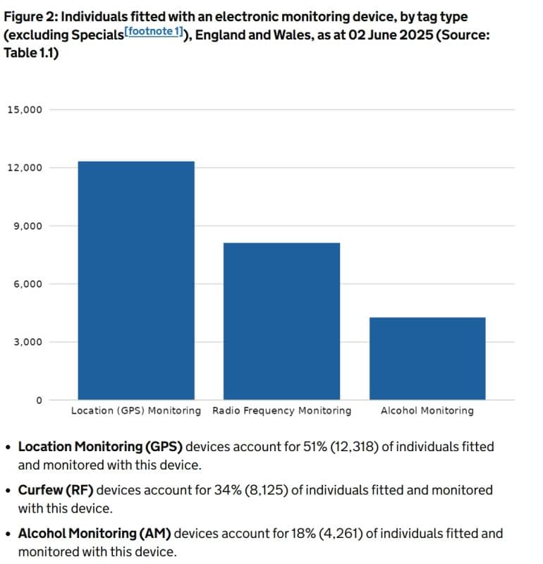 Given the Government’s repeated commitments to substantially expand the use of electronic monitoring, it seemed worthwhile to provide a short overview of the latest management information on tagging published by the MoJ yesterday (28 August 2025). The publication provides information about everyone subject to electronic monitoring on 2 June this year which amounted to 23,977 individuals.