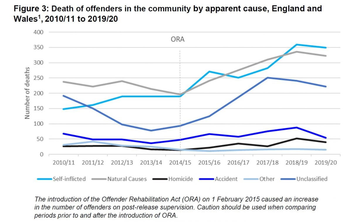 The headline figure for this year is that there were 1,002 deaths of offenders in the community. Although the statistical bulletin notes that this was a welcome drop of 8% from 1,094 deaths in 2018/19, it fails to note that the real fall was much smaller since the number of people subject to probation supervision fell by 5% over the same period.